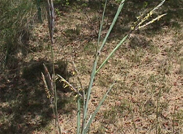 Bluestem This is one of the premier grasses in the tallgrass prairie. It can grow from 3 to 6 feet tall and is a favorite browse for cattle. It is blue-green in color and has a unique three pronged turkey-foot seed head. It is most easily identified in the fall when it has seed. Its roots can extend down 9 feet in the ground, therefore it can withstand long periods of dry weather and regrow with the next rain. |